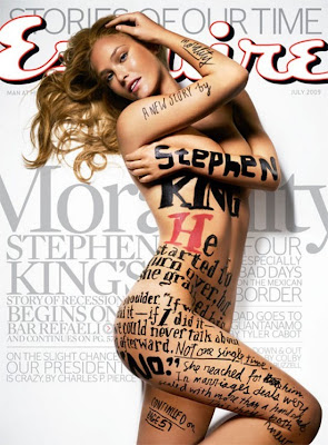 Here’s the beautiful Bar Refaeli posing nude on the July 2009 cover of Esquire magazine with parts of Stephen King’s short story “Morality” transcribed on her lovely body